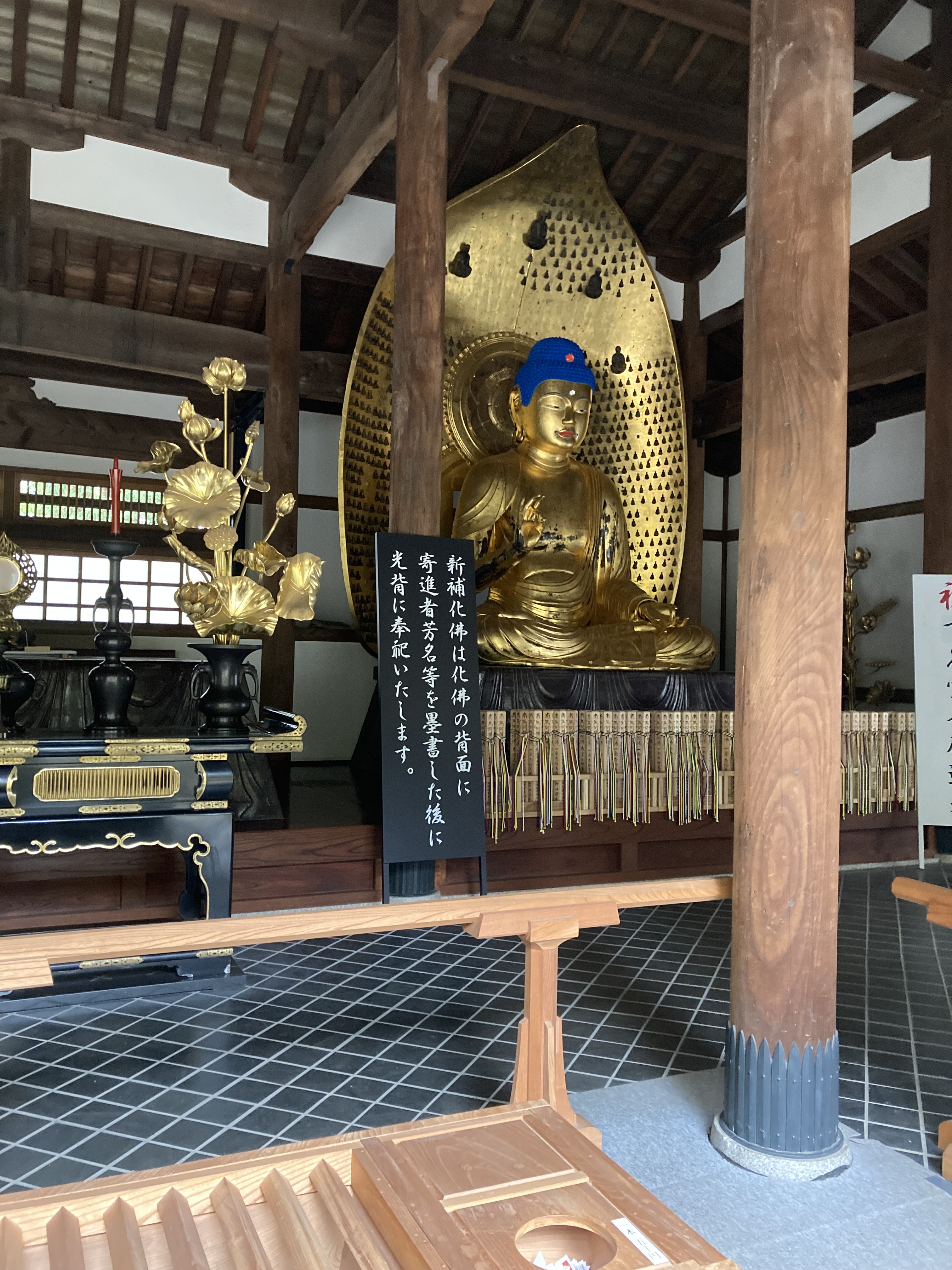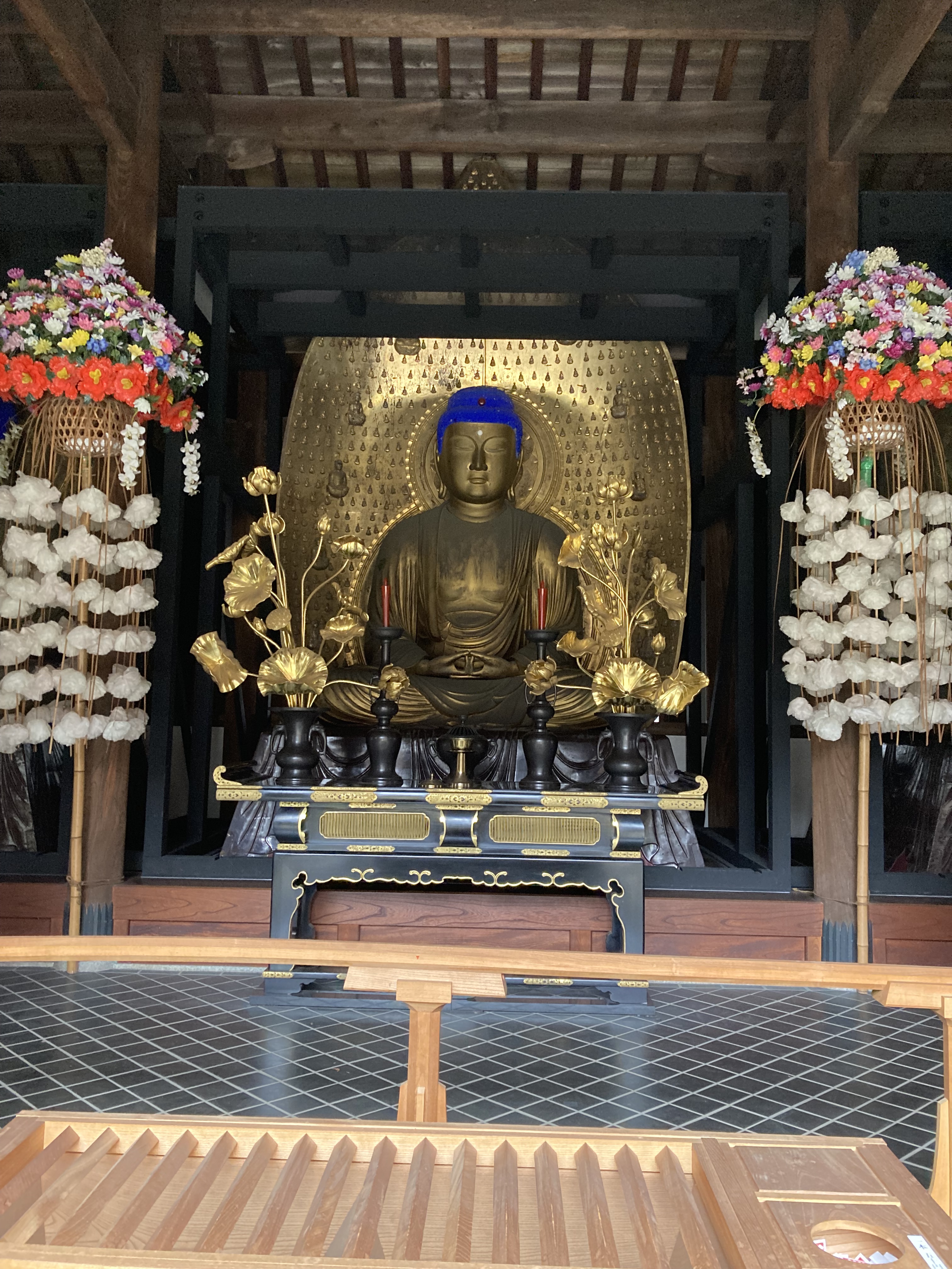 このお寺はその名の通り、9体の阿弥陀如来像が安置されており、境内の本堂の正面に3つの阿弥陀堂(上品堂、中品堂、下品堂)が並んで立ち、この中にそれぞれ3体の阿弥陀如来像(九品仏)が安置されています。