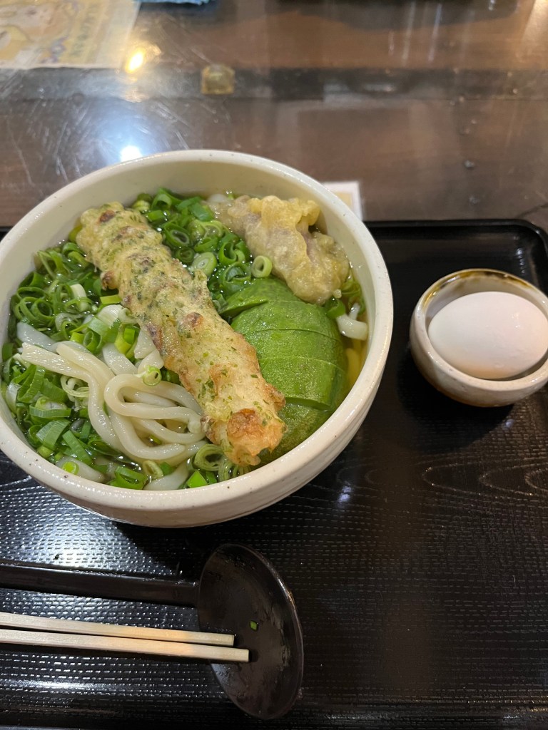 八百屋が始めたうどん屋の大常(だいつね)さんです。アボカドと九条ネギをトッピングしてもらい、天ぷらは自分でとります。いつもちょっと遅めのランチ時間帯に行くので天ぷらは好きなのが売り切れ。今回はちくわとミョウガをチョイス。それと温泉卵。