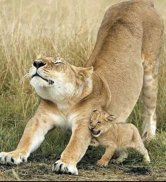 伸びをするお母さんライオンにすり寄る子供のライオンそしてしっかり毛づくろいしてもらいました~!(^^)!